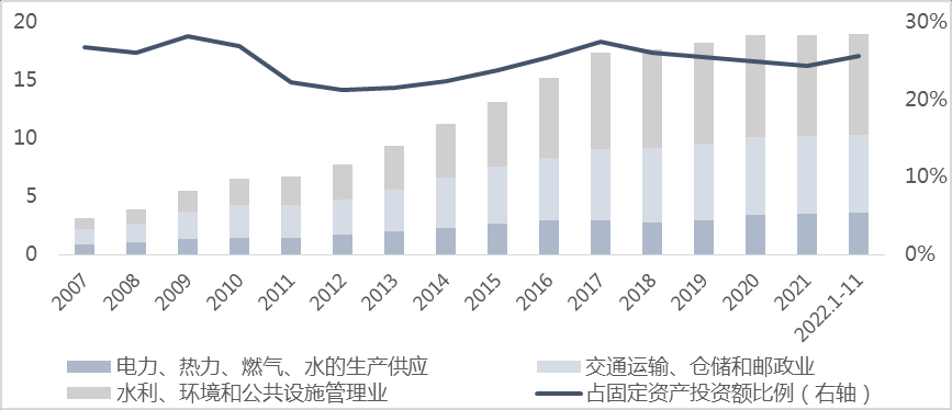 根據(jù)WIND數(shù)據(jù),廣義基建投資2021年達到18.9萬億元,占全社會固定資產(chǎn)投資額的24%,具體分為三大類行業(yè),一是交通運輸、倉儲和郵政業(yè),占2021年基建投資的36%,主要有道路運輸業(yè)(包括城市軌交,不含市政道路)、鐵路運輸業(yè)、倉儲業(yè)等;二是水利、環(huán)境和公共設(shè)施管理業(yè),占2021年基建投資的46%,主要有公共設(shè)施管理業(yè)(包括城市道路、排水、橋梁、廣場、公園等市政工程和城市公共設(shè)施)、水利管理業(yè)、生態(tài)保護和環(huán)境治理業(yè)等;三是電力、熱力、燃氣及水的生產(chǎn)和供應(yīng)業(yè),占2021年基建投資的18%。
